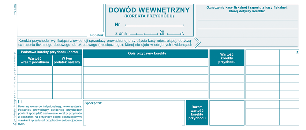 V-75 Dowód wewnętrzny - korekta przychodu wynikającego z raportu fiskalnego