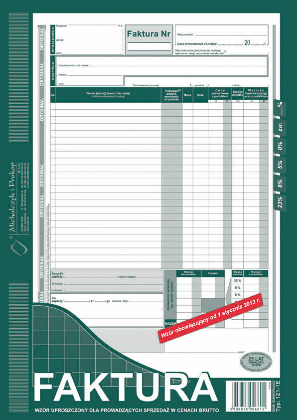 | zastosowanie: | faktury i inne dokumenty wynikające z przepisów o podatku od towarów i usług |
