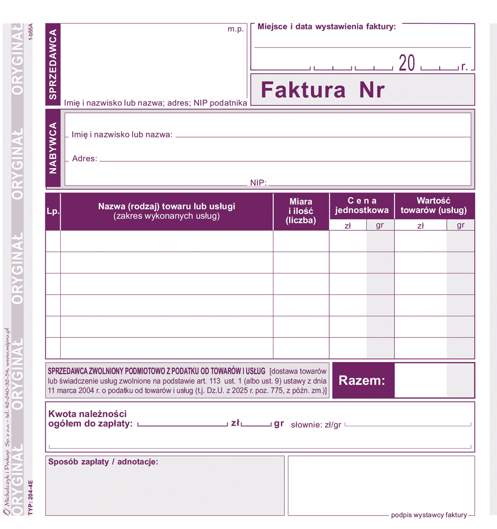 204-4E Faktura dla podatników zwolnionych podmiotowo z podatku od towarów i usług